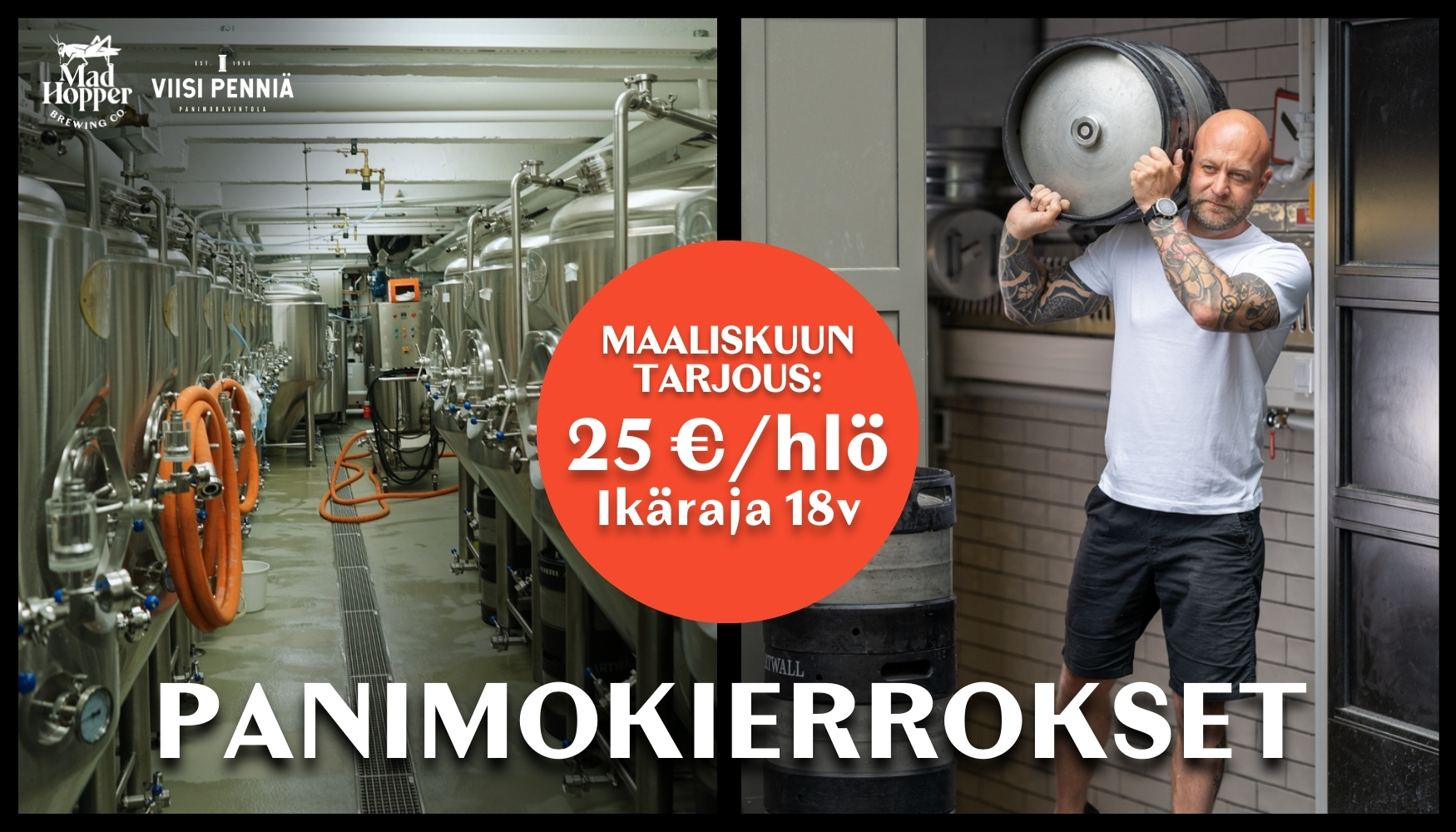 Tutus­tumme panimoon (opas­tettu kierros 45 min.) sekä mais­tamme neljää eri­laista Mad Hop­perin olutta (4 x 1,5 dl maisteluolut).